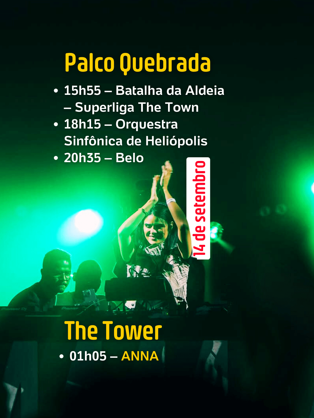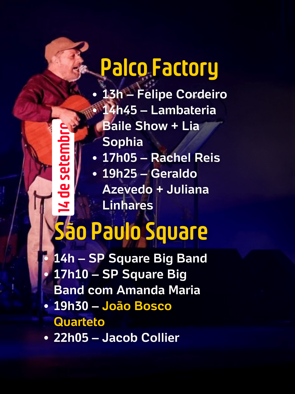 - Início dos shows principais: a partir das 15h50