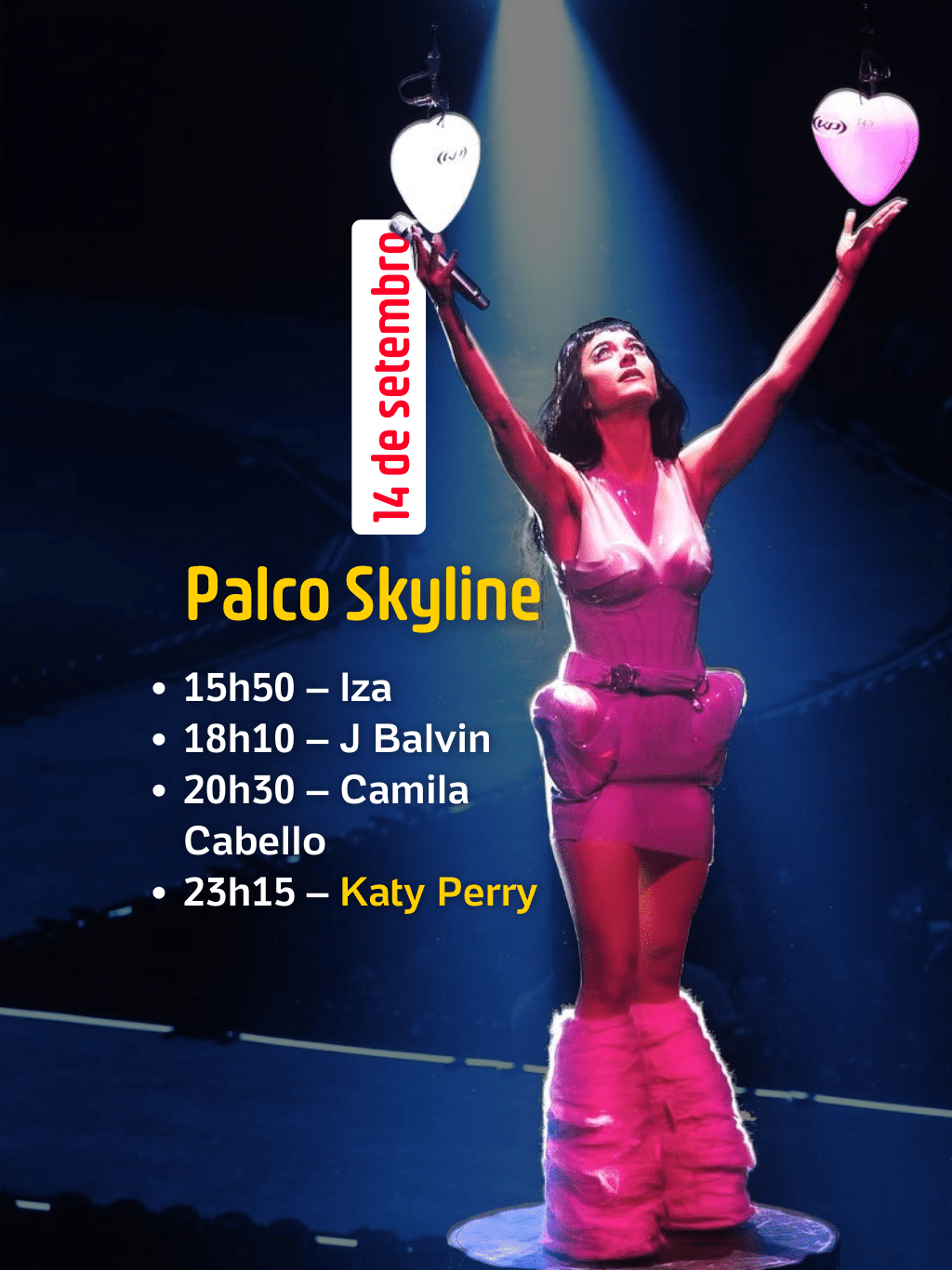 Katy Perry é a atração principal do Palco Skyline, com repertório voltado ao pop de arena. Antes dela, se apresentam Camila Cabello, J Balvin e IZA, em uma sequência que alterna referências latinas e nacionais. Os shows nesse palco começam às 15h50 e seguem até 23h15.