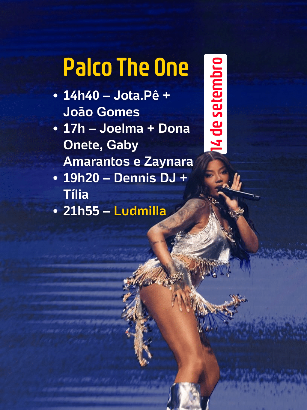 No Palco The One, a programação começa às 14h40 com Jota.pê, que convida João Gomes. Às 17h, Joelma se apresenta com Dona Onete, Gaby Amarantos e Zaynara. Em seguida, às 19h20, é a vez de Dennis DJ, com participação de Tília. O encerramento fica por conta de Ludmilla, às 21h55.