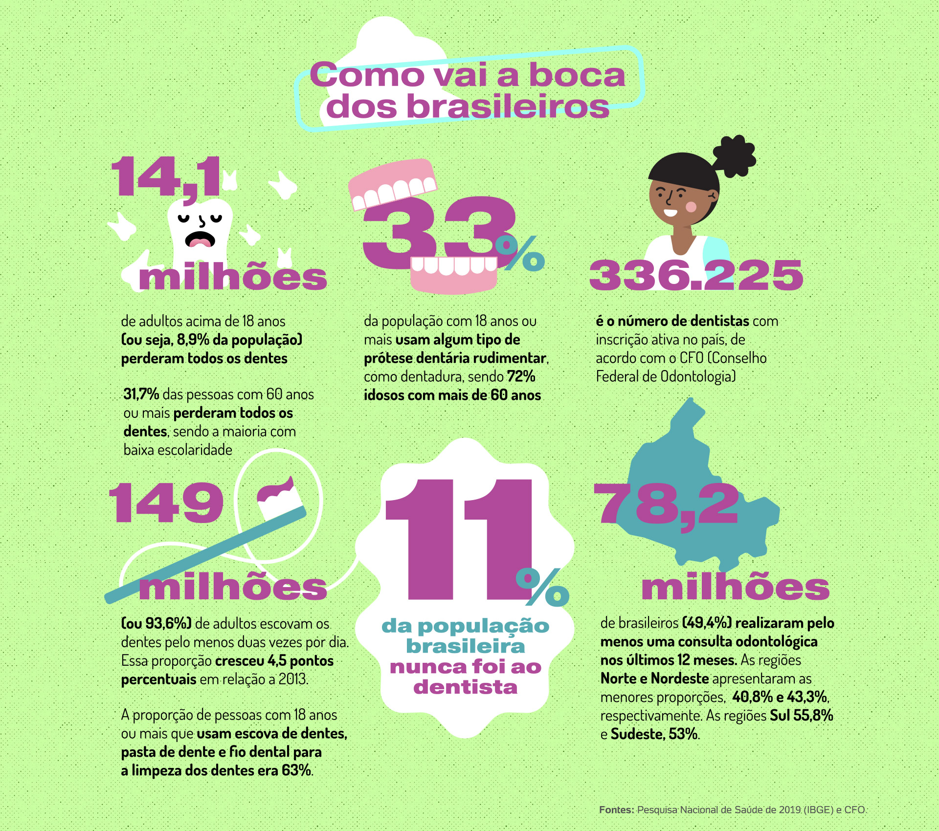 Também está intimamente ligada à autoestima. Quem não gosta de abrir um sorriso sem medo? Só que para isso é preciso ter uma boca saudável, o que ainda não é a realidade de muitos. Segundo dados do IBGE (Instituto Brasileiro de Geografia e Estatística) de 2019, 32% das pessoas com 60 anos ou mais perderam todos os dentes. No mundo, 3,5 bilhões de pessoas, ou quase metade da população mundial, são afetadas por algum tipo de doença bucal, de acordo com a OMS (Organização Mundial de Saúde).
